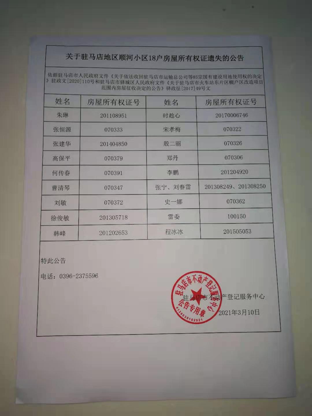关于驻马店地区顺河小区18户房屋所有权证遗失的公告