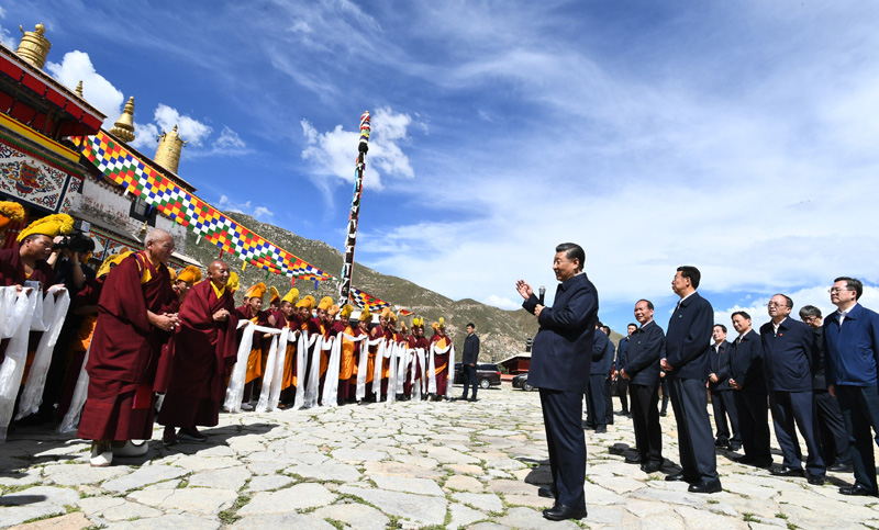 7月21日至23日,中共中央总书记、国家主席、中央军委主席习近平来到西藏,祝贺西藏和平解放70周年,看望慰问西藏各族干部群众。这是22日下午,习近平在位于拉萨西郊的哲蚌寺考察。新华社记者 谢环驰 摄