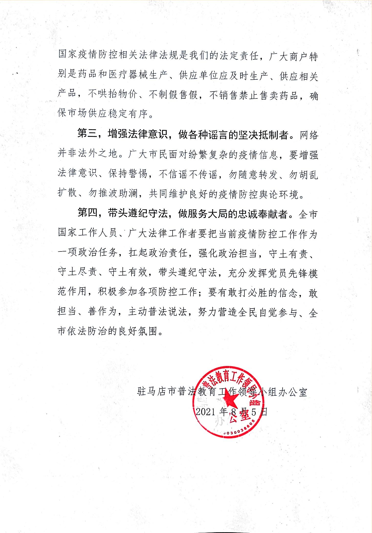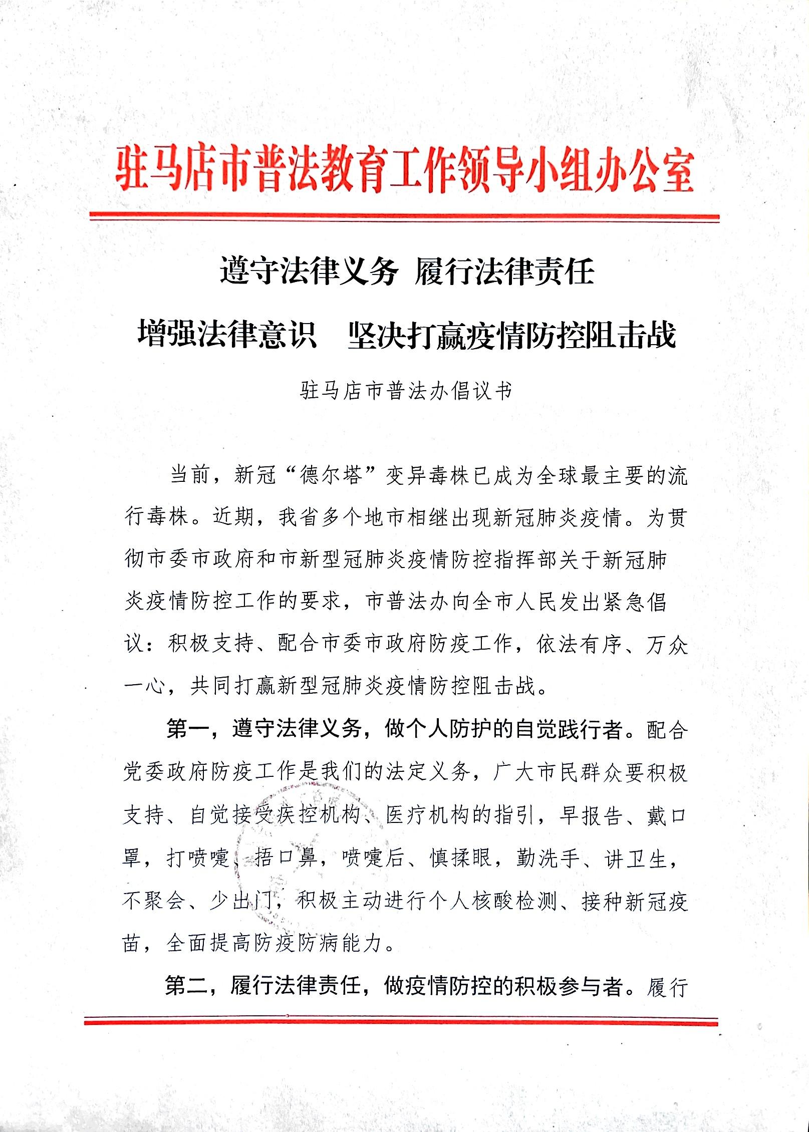 驻马店市普法办倡议书