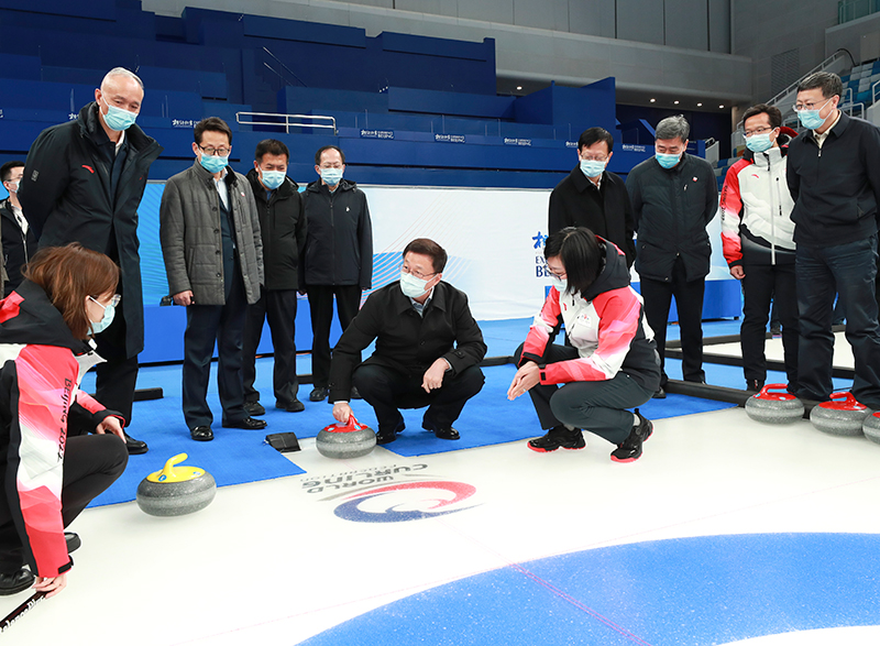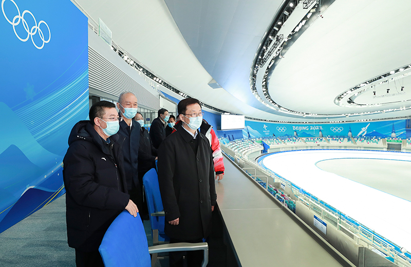 韩正在有“冰丝带”之称的国家速滑馆,观看了“相约北京”系列测试赛汇报视频,并听取场馆建设、赛事筹备、场馆制冰等情况汇报。到国家体育馆,了解场馆布局、功能分区、疫情防控等情况,察看冰球比赛场地、运动员更衣室设施情况。在国家游泳中心,听取“水冰转换”和场馆改造、奥林匹克大家庭接待、赛时场馆景观设置等情况汇报,实地考察冰壶比赛项目,与工作人员亲切交流。韩正表示,北京冬奥会、冬残奥会筹办工作已经进入关键时期,要按规划高质量完成场馆及配套设施建设,扎实做好场馆运行工作,为赛事顺利举办提供有力支撑。要认真研究冬奥场馆赛后利用,把举办重大赛事同服务全民健身结合起来,推动冰雪运动普及发展。