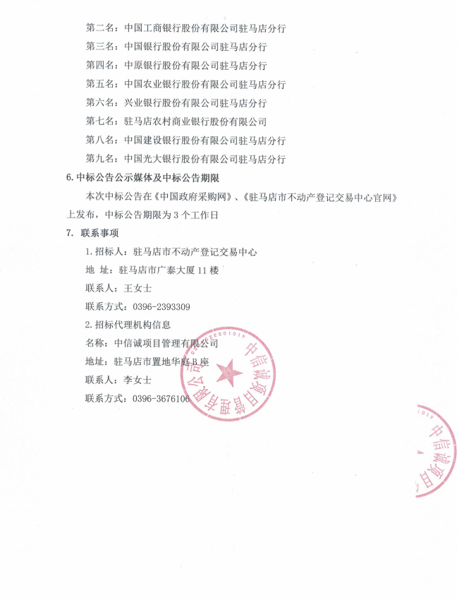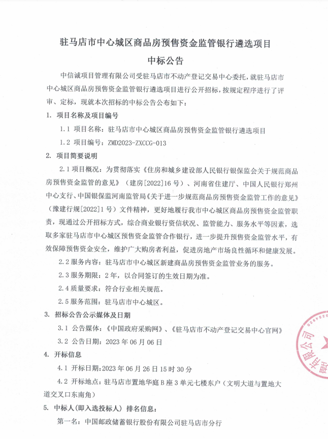 驻马店市中心城区商品房预售资金监管银行遴选项目中标公告