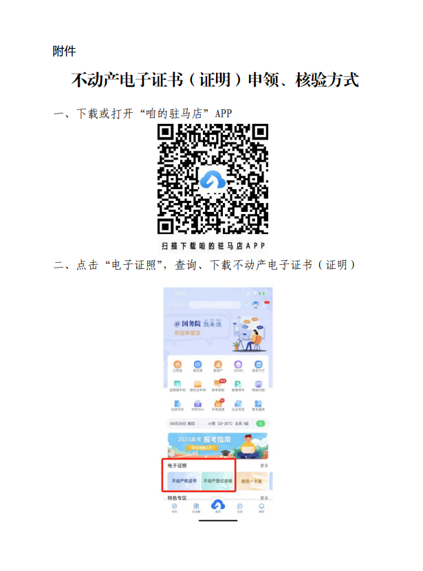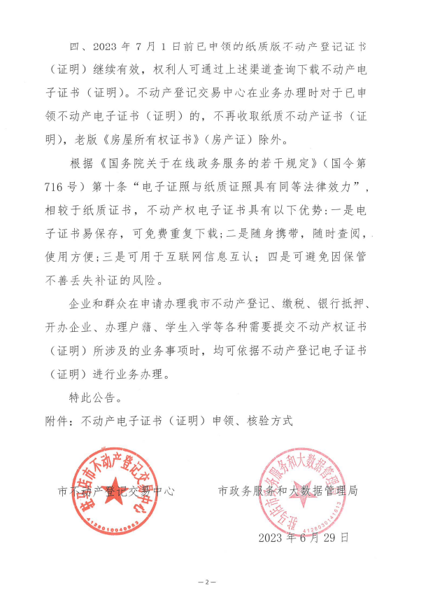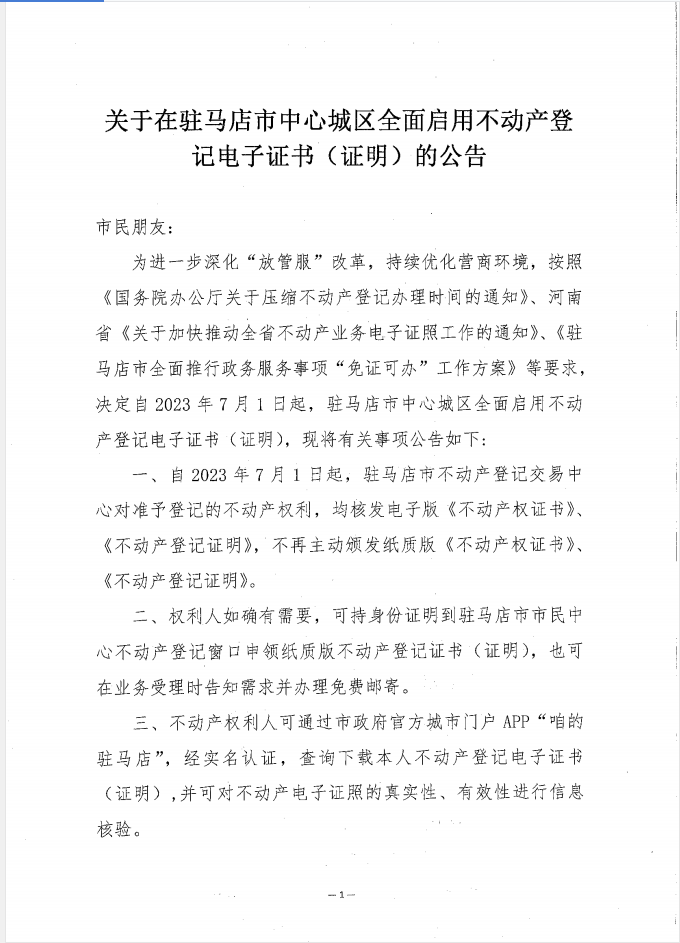 关于在驻马店市中心城区全面启用不动产登记电子证书(证明)的公告