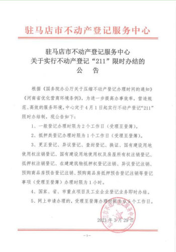 驻马店市不动产登记服务中心关于实行不动产登记“211”限时办结的公告