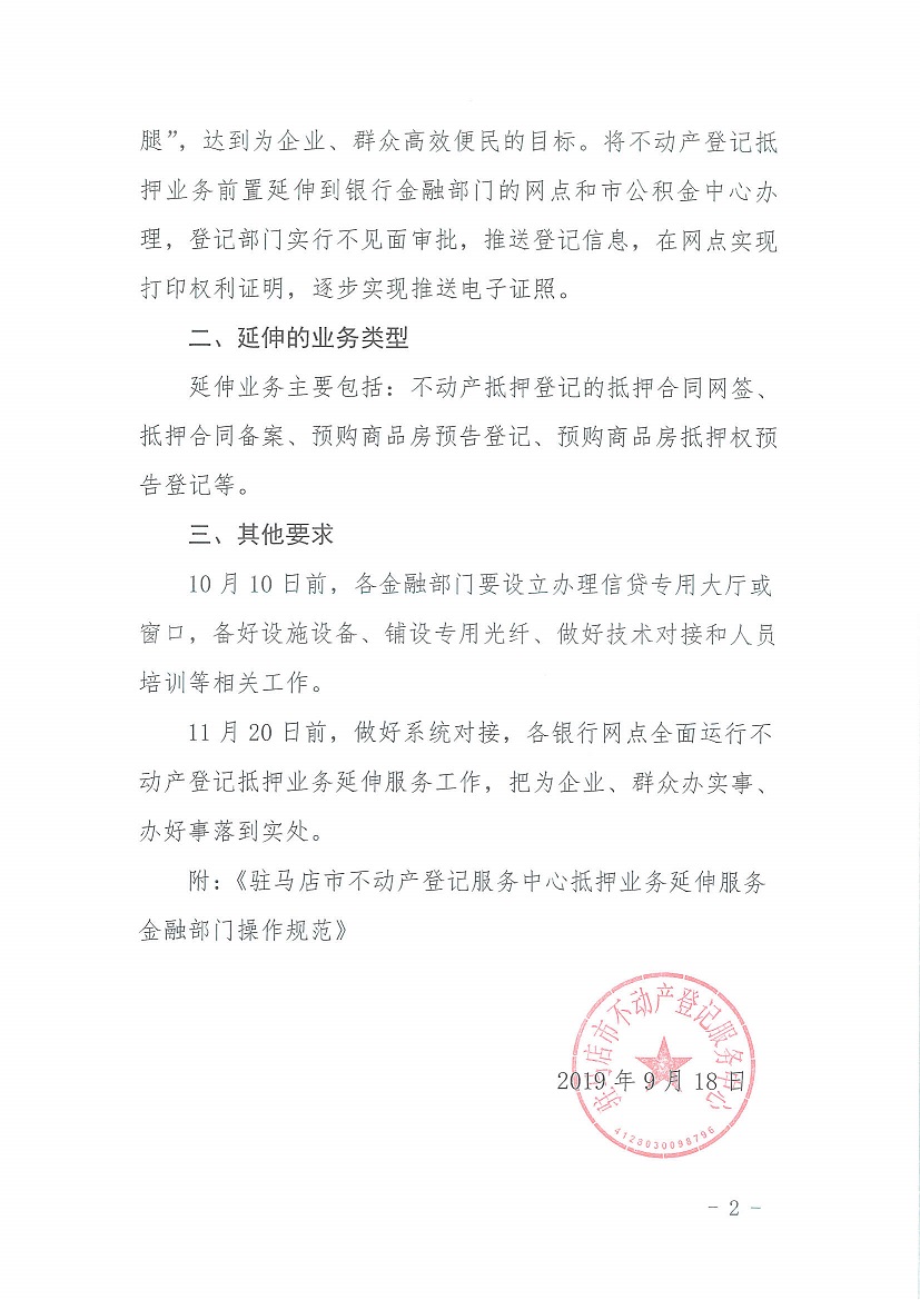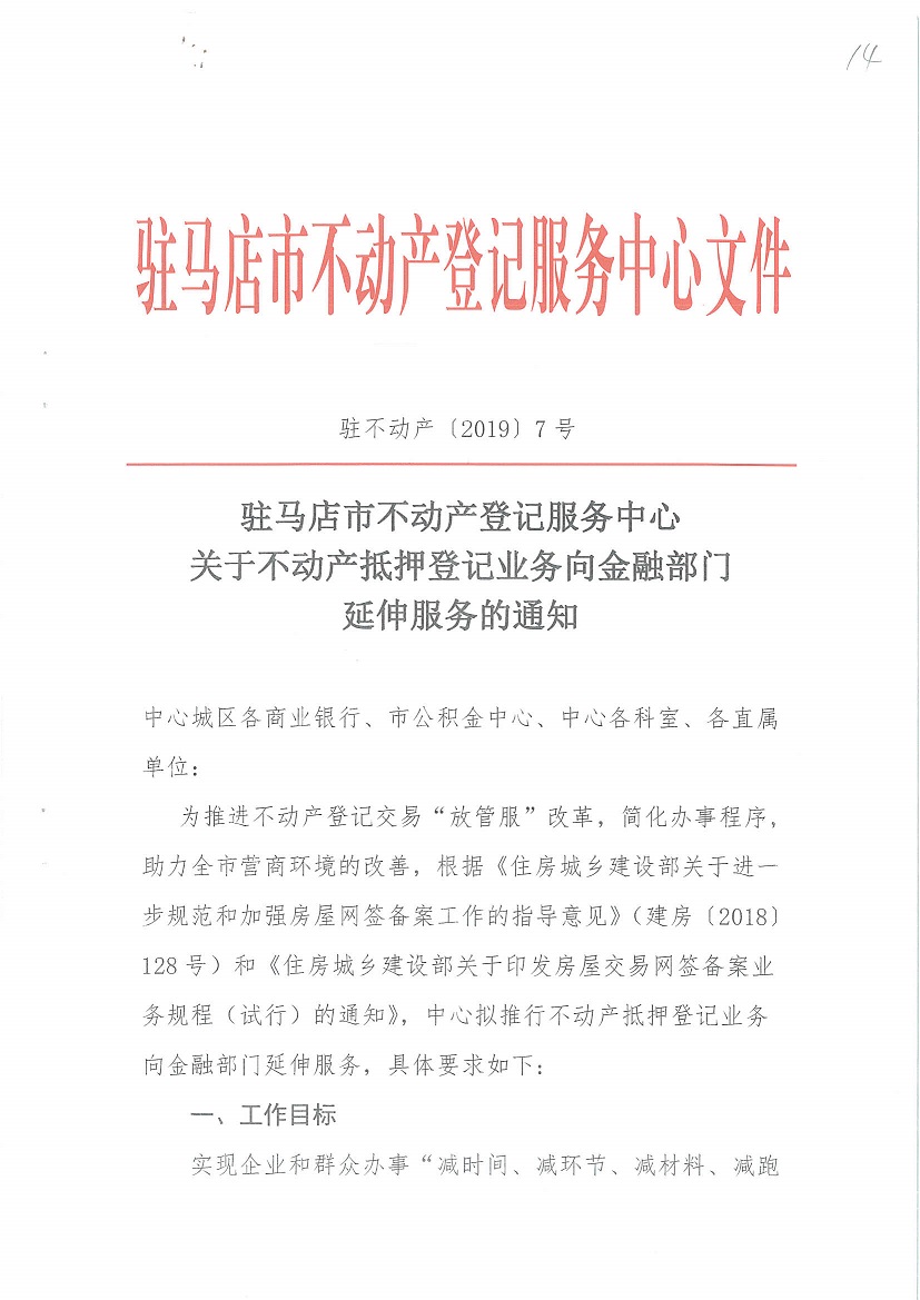 驻马店市不动产登记服务中心关于不动产抵押登记业务向金融部门延伸服务的通知