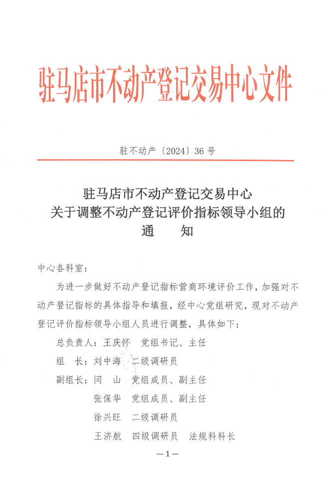 关于成立不动产登记评价指标领导小组的 通 知