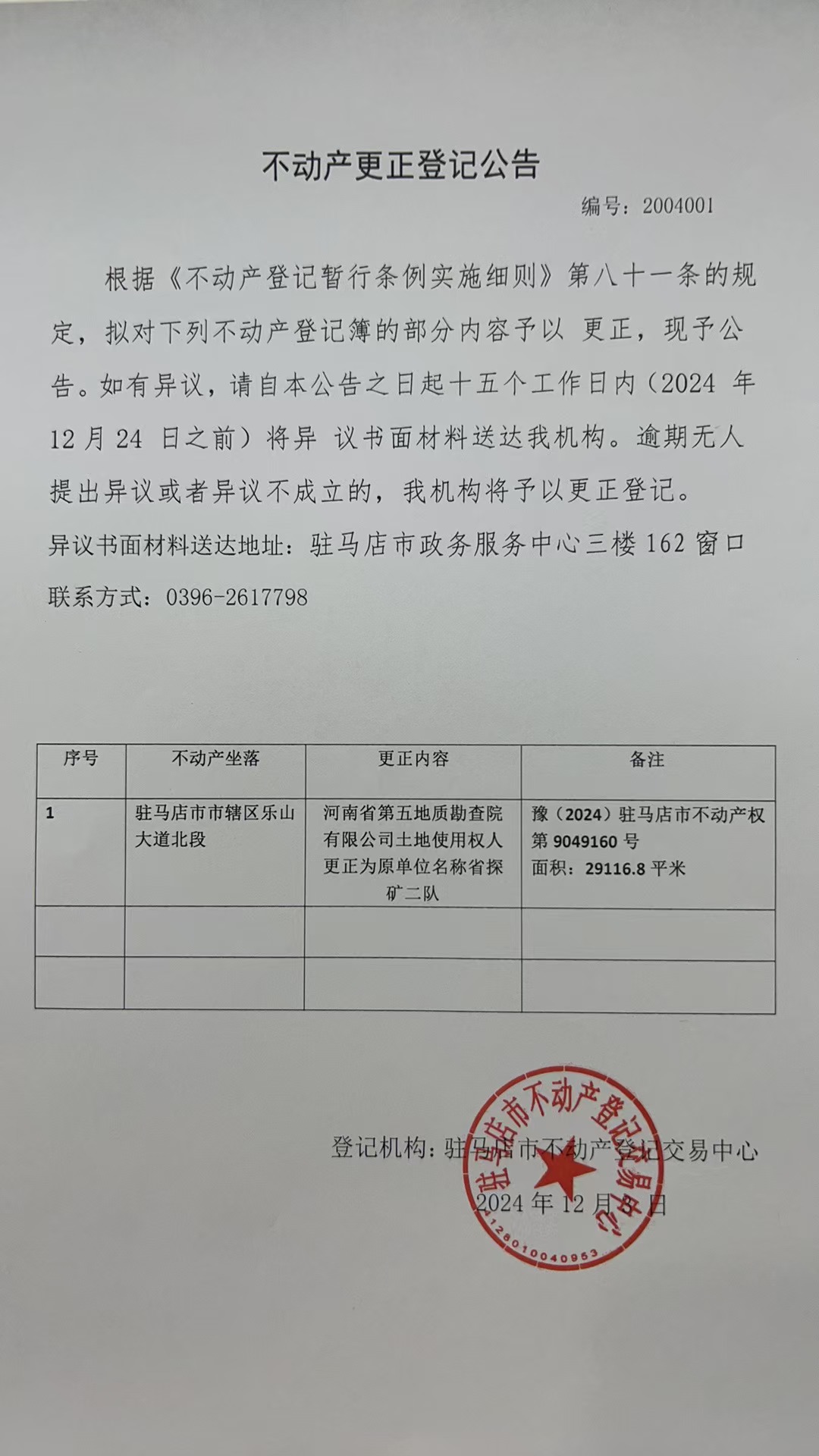 不动产更正登记公告(编号:2004001)