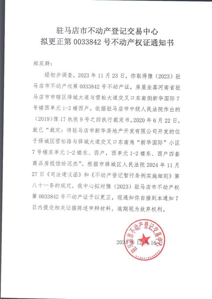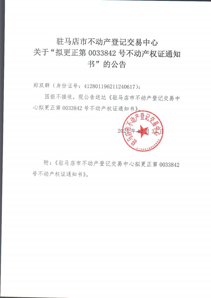 驻马店市不动产登记交易中心关于“拟更正第0033842号不动产权证通知书”的公告