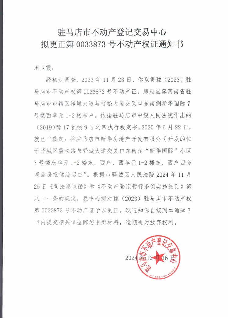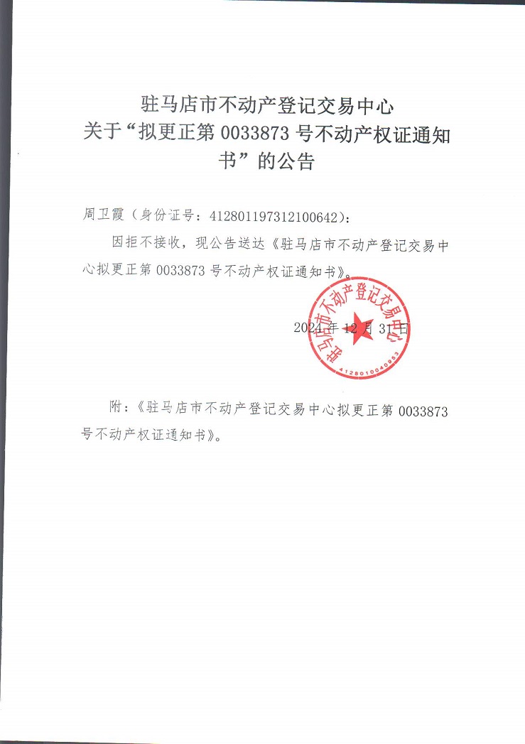 驻马店市不动产登记交易中心关于“拟更正第 0033873 号不动产权证通知书”的公告