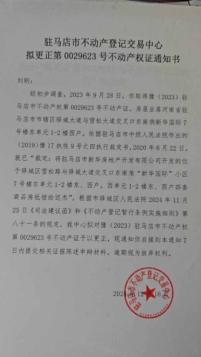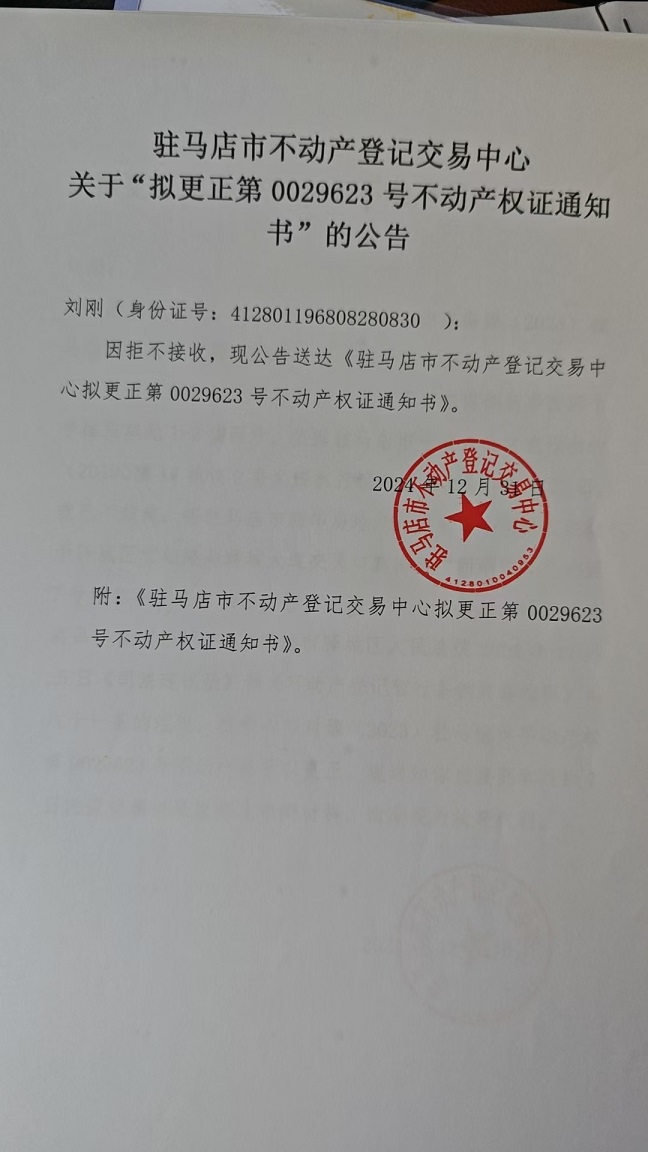 驻马店市不动产登记交易中心关于“拟更正第0029623号不动产权证通知书”的公告