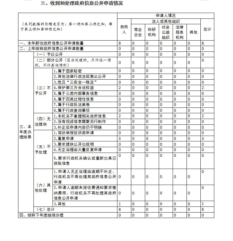 本年度收到政府信息公开申请8条,经审查均不符合政府信息公开政策。因政府信息公开引发的行政复议案件3起,复议后起诉案件1起,均为结果维持。