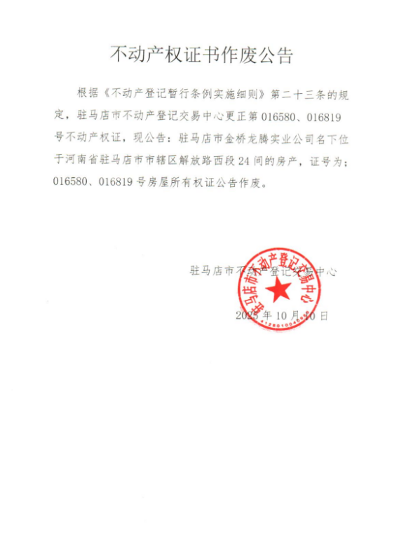 驻马店市金桥龙腾实业公司的不动产权证书作废公告
