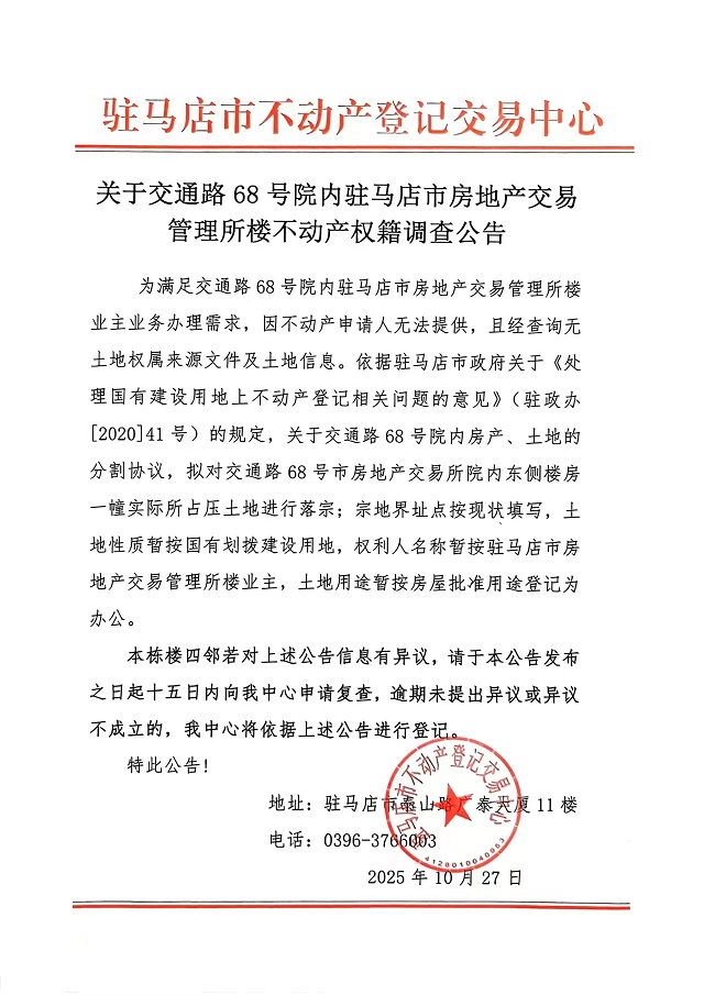 关于交通路68号院内驻马店市房地产交易管理所楼不动产权籍调查公告