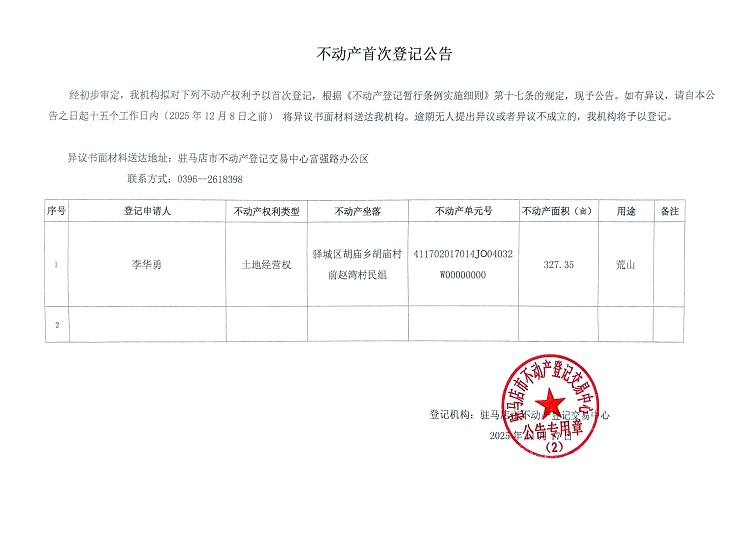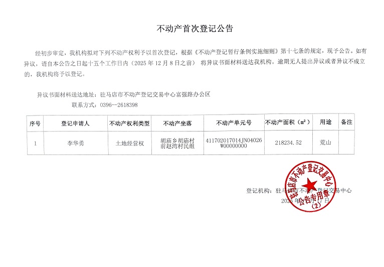 胡庙乡胡庙村前赵湾村民组不动产首次登记公告