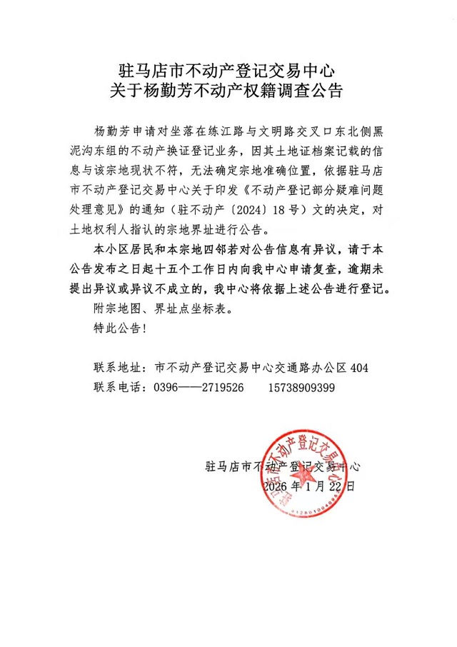 关于杨勤芳不动产权籍调查公告