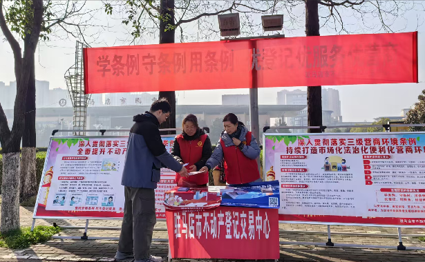 为深入贯彻落实优化营商环境相关法律法规,进一步提升企业和群众对《优化营商环境条例》《河南省优化营商环境条例》《驻马店市优化营商环境条例》(以下简称“三条例”)的知晓率和认知度,持续擦亮不动产登记便民利企服务品牌,2026年3月3日,市不动产登记交易中心在市政府南门天中广场参加市发改委组织的营商环境“三条例”系列集中宣传活动。