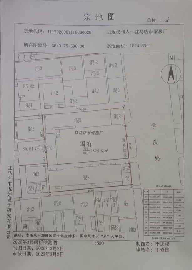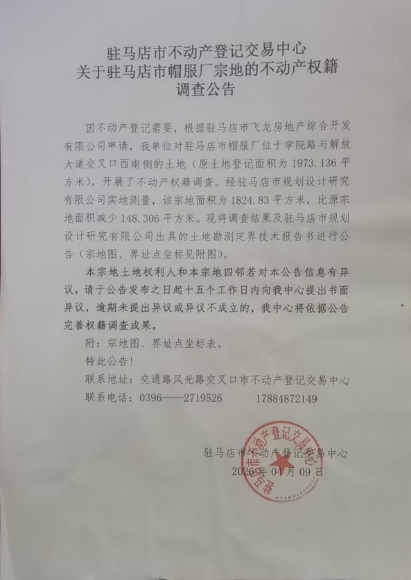 关于驻马店市帽服厂宗地的不动产权籍调查公告